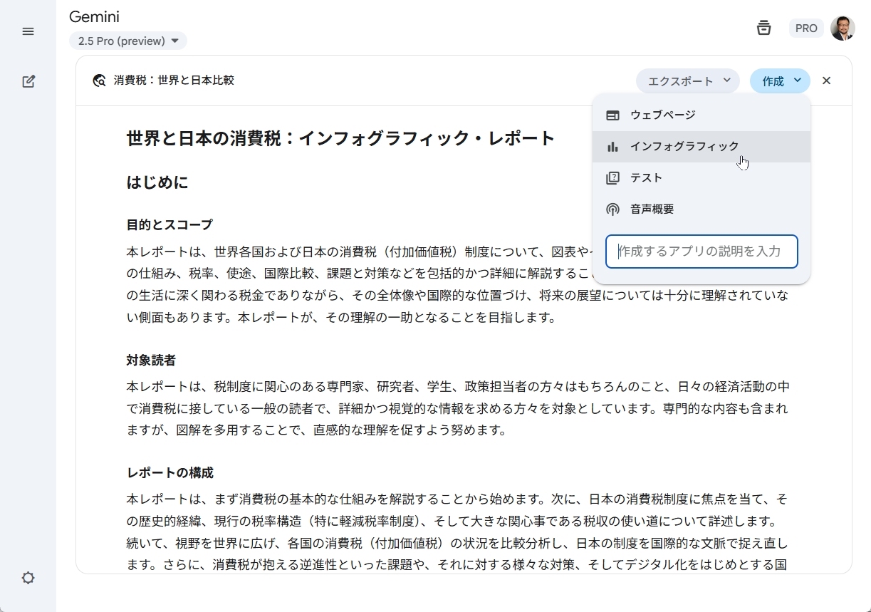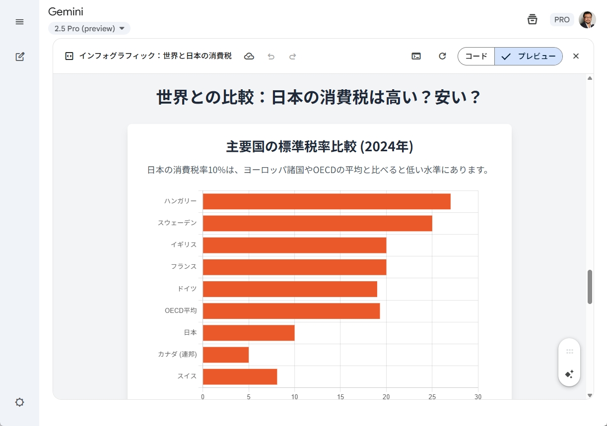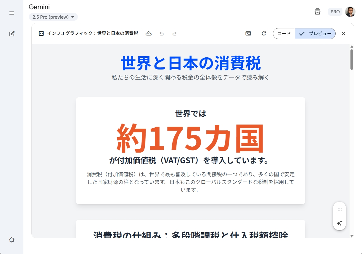 ディープリサーチ機能を使って徹底的に調査した内容からインフォグラフィックに仕立ててもらうこともできます。例えば、Geminiで「Deep Research」をオンにして、世界と日本の消費税について調べた結果をインフォグラフィックにするように指示してみました。