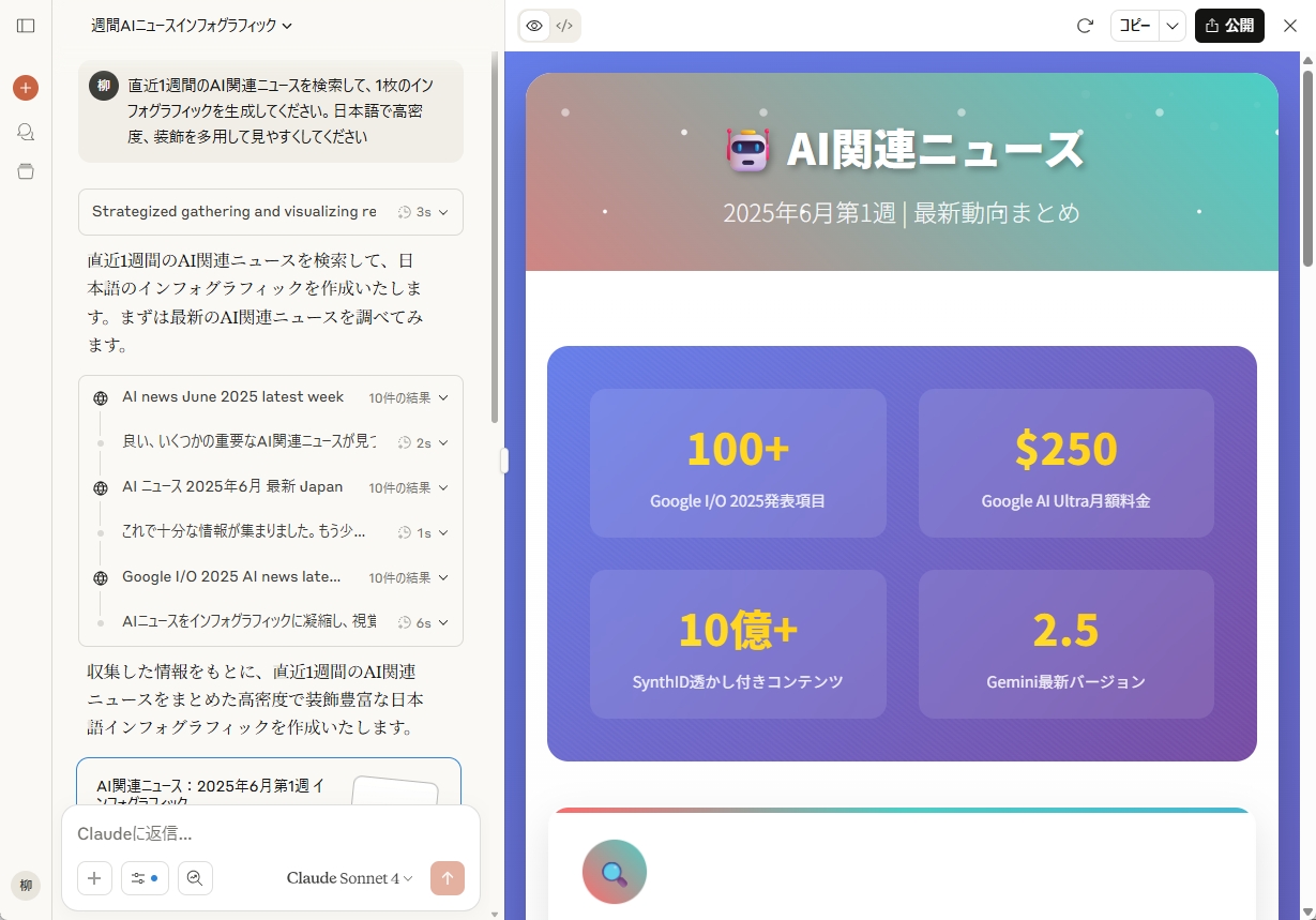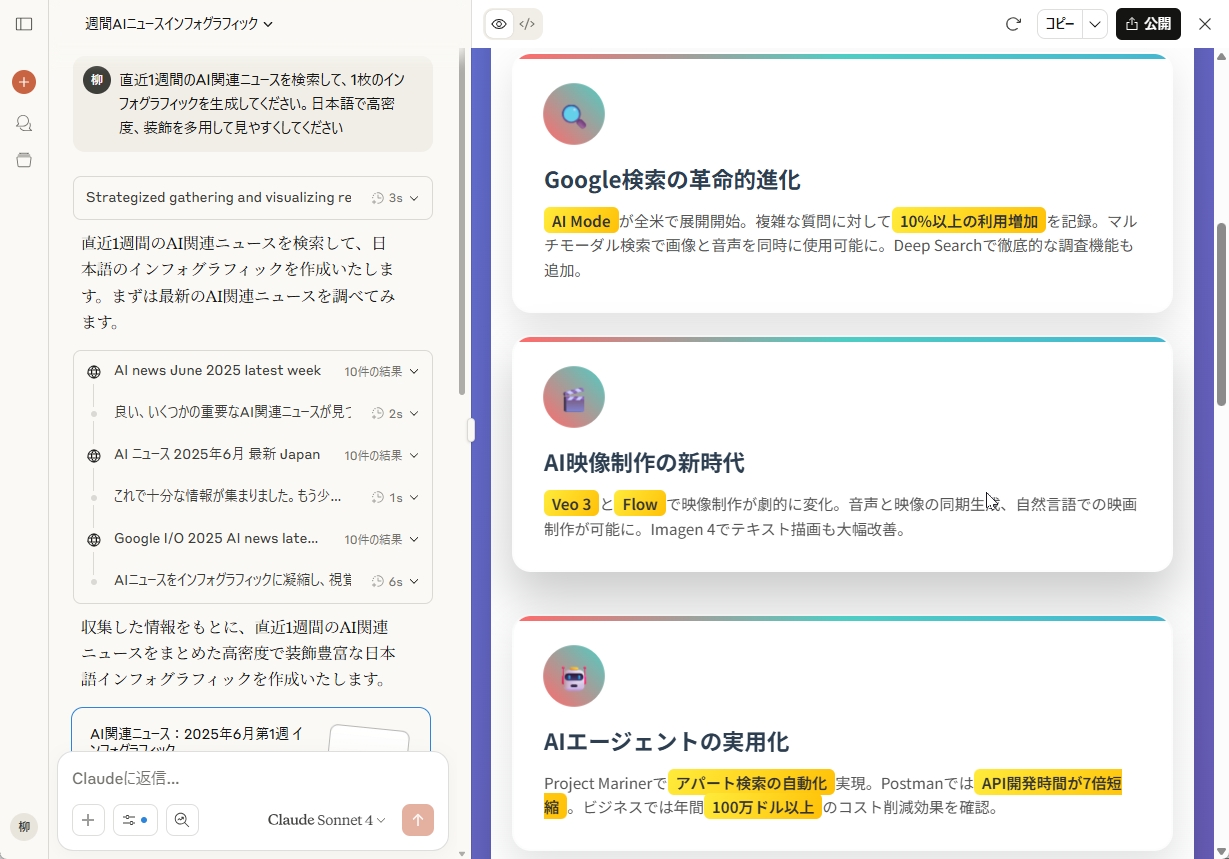 生成AIによって、作成するインフォグラフィックの癖は大きく異なります。Geminiはクールなレポート風になることが多いですが、Claudeはビジュアルを多用したデザインになります。