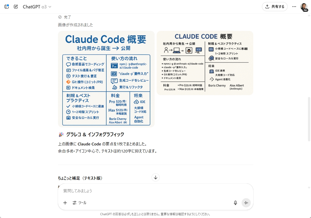 ChatGPTでも生成できるのですが、文字が多くなると日本語のフォントがおかしくなる可能性が高まります。込み入った内容をまとめるなら、Claudeが向いています。