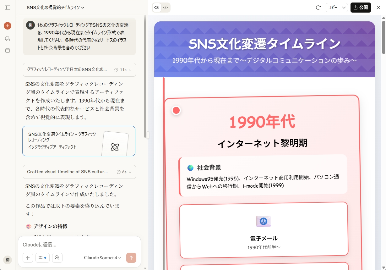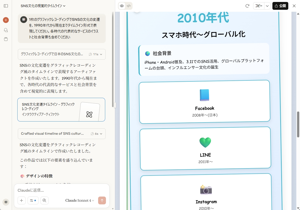 歴史や沿革を把握したいときには、タイムライン形式で表示させてみましょう。ここでは、1990年代から現在にいたるまでのSNS文化をまとめてもらいました。最初に試したときには、シンプルな羅列になってしまったので、時代背景やイラストを入れるように指示してみました。