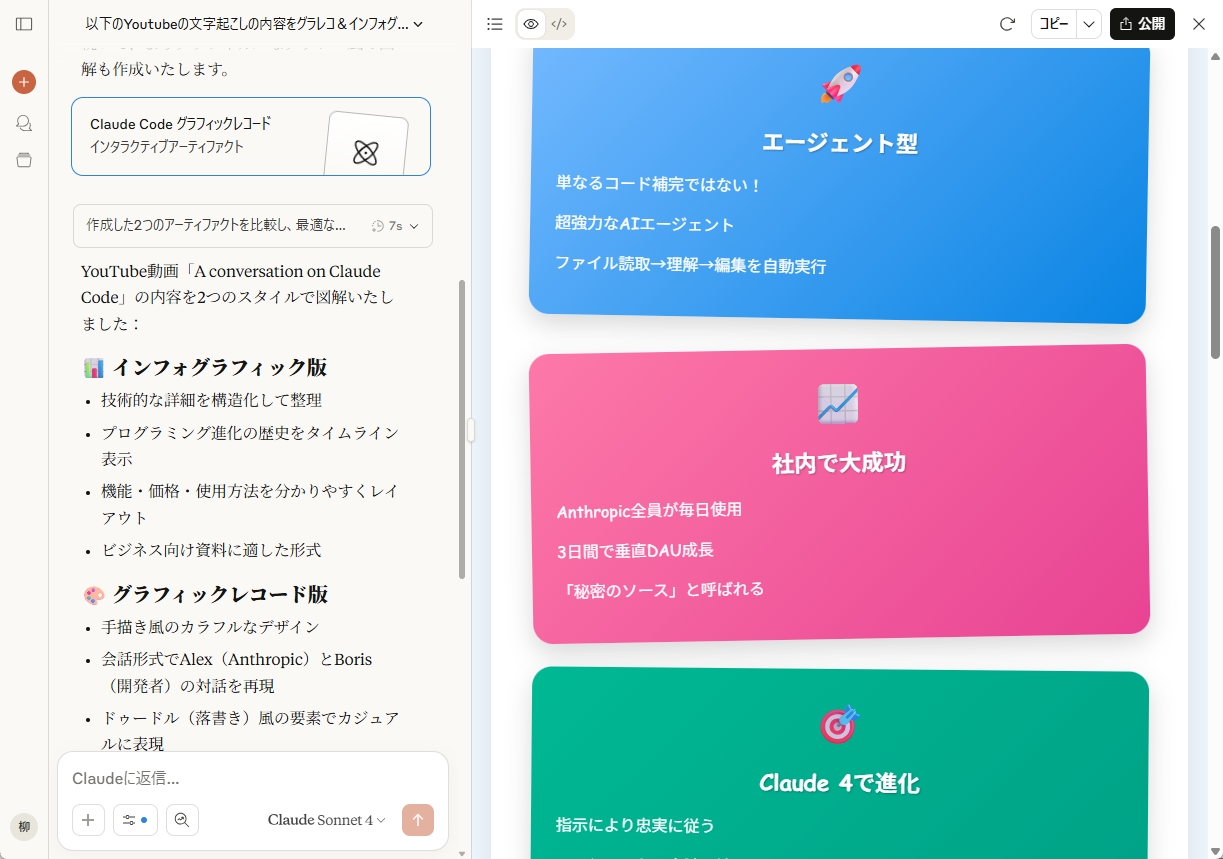 今回は、Claudeに先日発表された「Claude Code」の動画をまとめてもらいました。今はYoutubeのURLを渡しても、中身を見ることができないので、文字起こしのテキストを貼り付けてあげましょう。