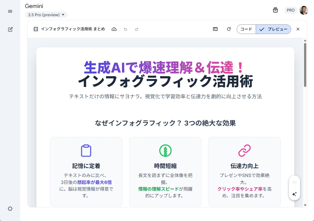 Geminiで「Deep Reserch」を使って調査したら、「インフォグラフィック」を作成します。