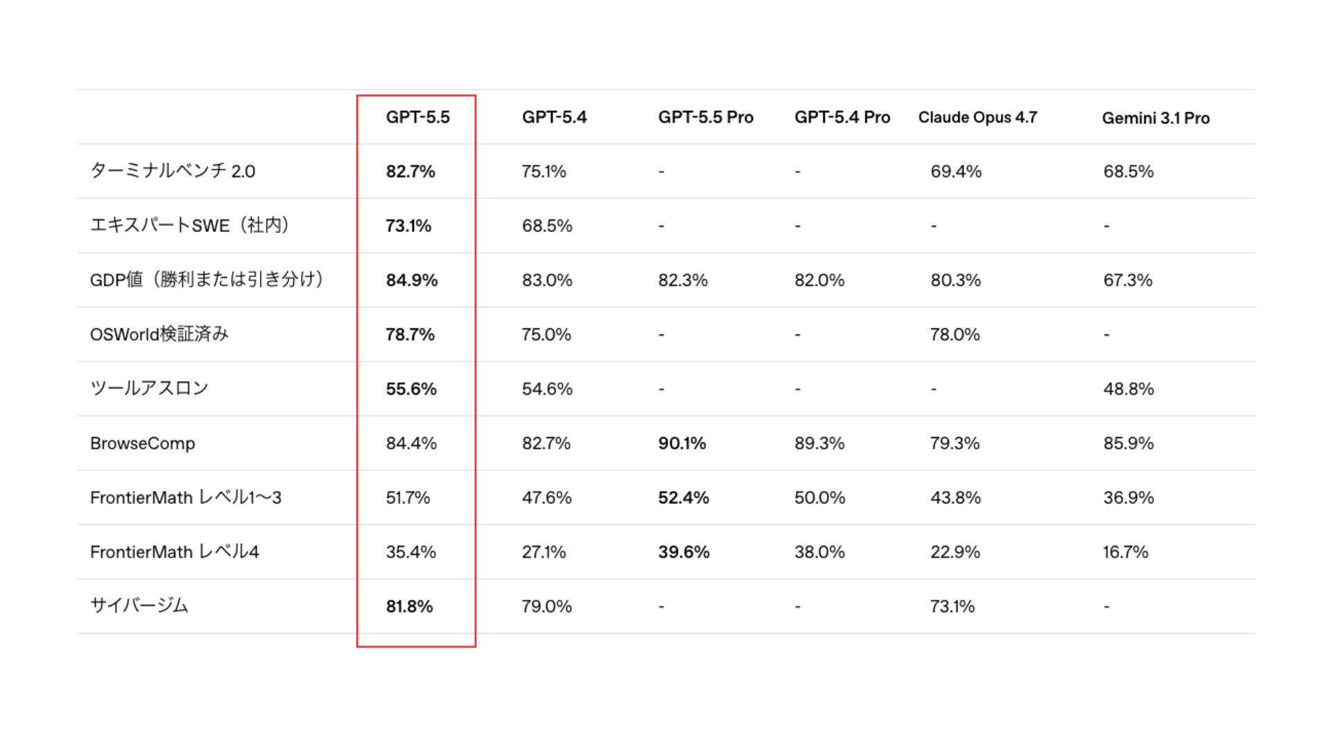数学的推論(MATH)や複雑なコード生成(HumanEval)において、エージェント的コーディング(Terminal-Bench 2.0など)や知識・研究系ベンチマークにおいて、GPT-5.4やClaude Opus 4.7、Gemini 3.1 Pro等を上回るスコアを達成。 論理的な飛躍が極めて少なく、専門性の高い業務においても信頼に値する回答を出力できます。