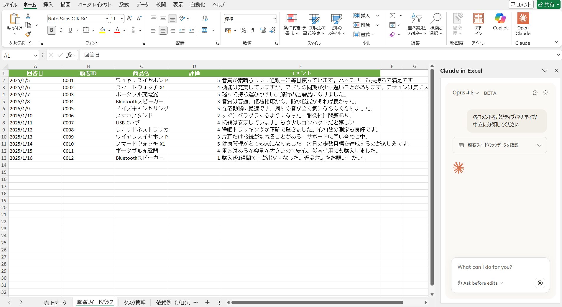 ①指示:範囲を指定して「各コメントをポジティブ/ネガティブ/中立に分類してください」と依頼