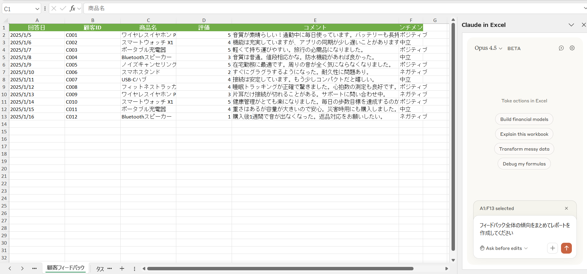 商品リストやレポート案などのセル範囲を選択し、「英語に翻訳して」「ビジネス向けの丁寧なトーンに書き直して」といった指示をClaudeに送れば、結果をワークシートに書き戻すことができます。文脈を理解するClaudeの特性により、単純な直訳ではない、自然な表現のアウトプットが期待できます。