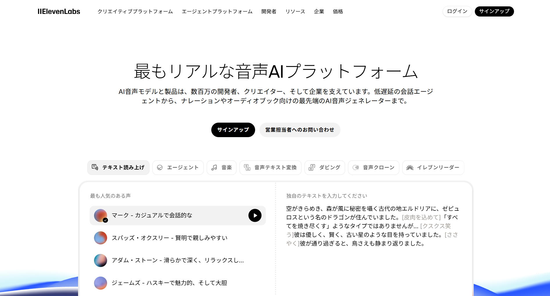 米国発の最先端AI音声生成サービスです。特に「人間と区別がつかないほどの自然さ」と「感情表現」において圧倒的な品質を誇ります。