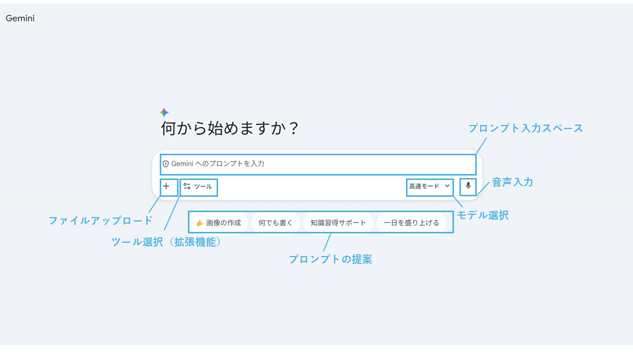 画面中央にある入力欄です。ここに質問や指示を入力してGeminiと会話を始めます。 テキストを入力してEnterキーを押すか、送信ボタンをクリックすると、AIが応答を生成します。