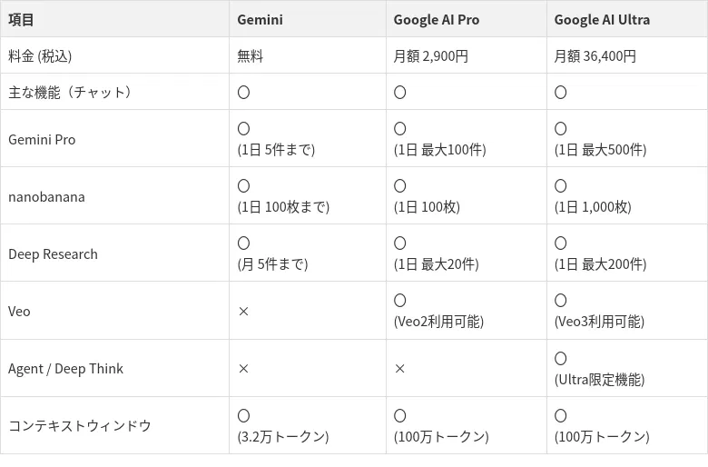 まずは無料プランで基本機能を体験するのがおすすめです。より高度な機能や利用上限の拡張を求める場合は、Google AI Proへのアップグレードを検討するとよいでしょう。 映像制作や大規模な研究など、AIをフル活用したいプロフェッショナルにはGoogle AI Ultraが適しています。