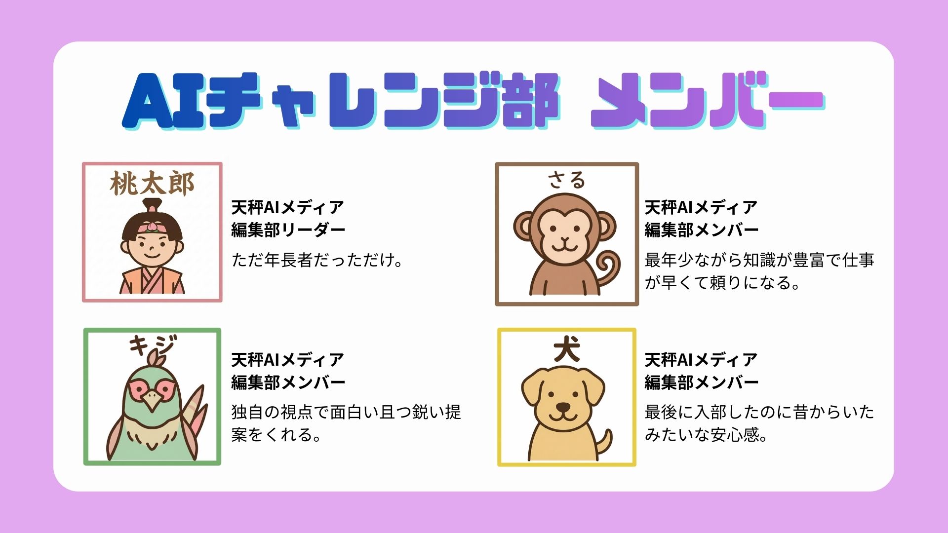 桃太郎: さて、皆さん。「天秤AIメディアAIチャレンジ部(通称:天チャレ)」、2回目の活動です! 今回はなんと、弊社サービス「天秤AI」のPlus版とBiz版に2025年12月に搭載された「画像生成機能」を使ったチャレンジをやっていきたいと思います! |
