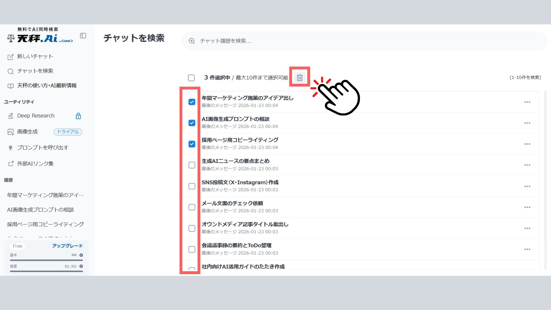 不要になった過去の試行錯誤ログを、複数選択してワンクリックで一括削除。チャットを簡単に整理できます。